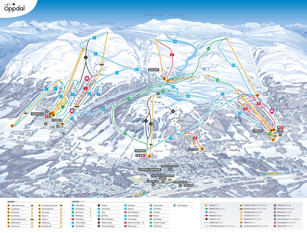 Løypene i Oppdal Skisenter finner du fordelt over hele 4 fjell, med 13 heiser og 35 nedfarter. Skisenteret er knyttet sammen med overfarter og heiser, slik at du kan kombinere høyfjellskjøring med cruising i løypa, akrobatikk i terrengparken og morsom pudderlek i skogen.